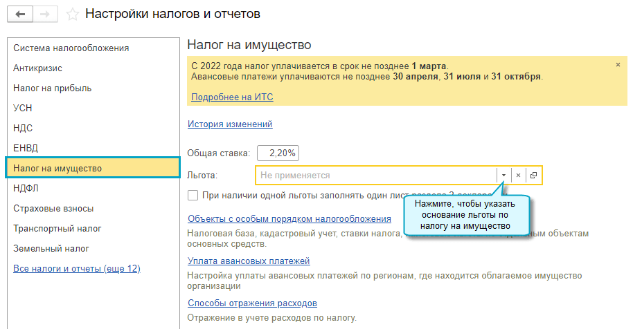 Простой интерфейс: меню "Настройки - Настройка налогов и отчетов".