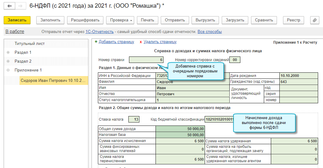Добавлена возможность подготовить уточненную форму 6-НДФЛ, когда обнаружено, что физическому лицу в отчетном году не были своевременно начислены доходы, и начисление выполнено после сдачи формы 6-НДФЛ. В этом случае заполняется новая справка о доходах и суммах налогов физического лица.
