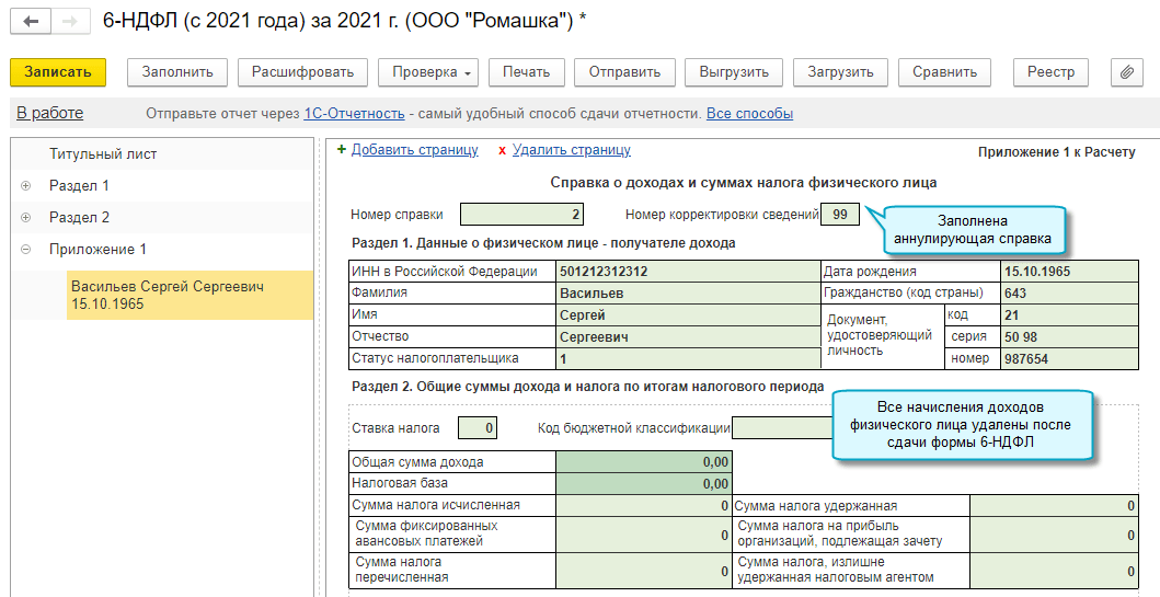 Добавлена возможность подготовить уточненную форму 6-НДФЛ, когда после ее сдачи обнаружено, что физическому лицу ошибочно начислены доходы, и сторнированы начисления всех доходов в отчетном году. В этом случае заполняется аннулирующая справка о доходах и суммах налогов физического лица.