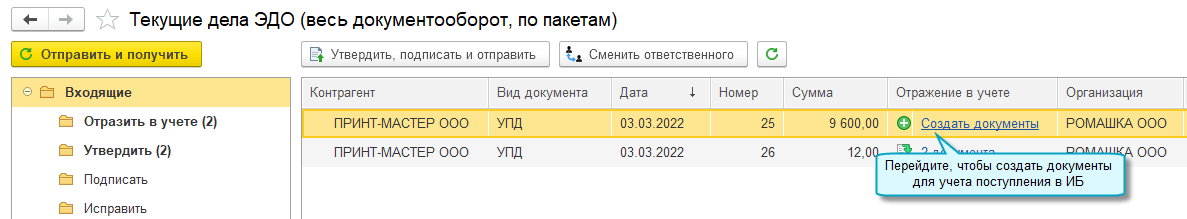 Простой интерфейс: меню "Документы - Поступление (акты, накладные, УПД) - ЭДО - Текущие дела ЭДО".