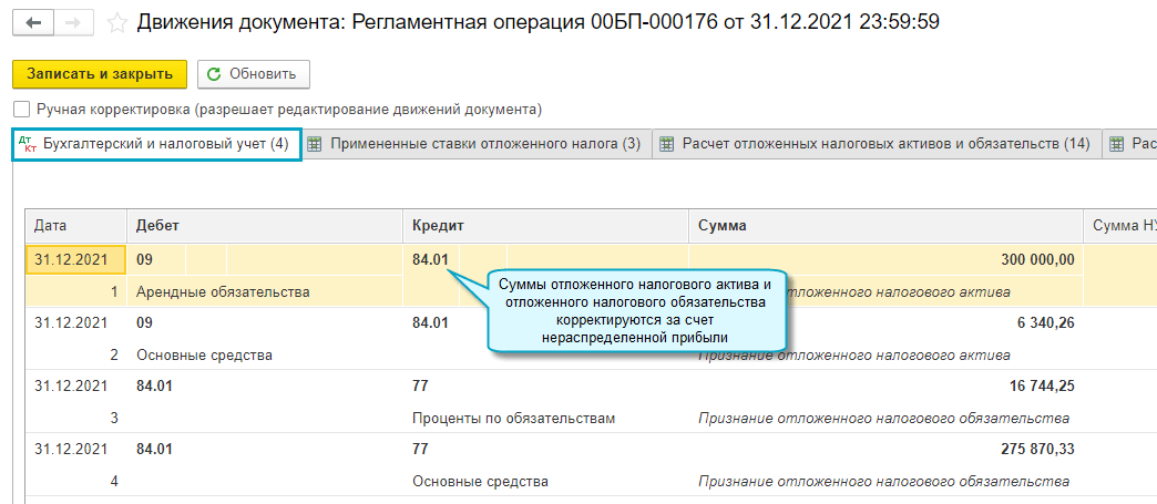 Добавлена регламентная операция Корректировка отложенного налога по ПБУ 18 с проводками по признанию отложенного налога на прибыль по разницам между бухгалтерским и налоговым учетом, отраженным в межотчетный период. К ним относятся разницы, возникшие по операциям Переход на ФСБУ 25, Переход на ФСБУ 6 и по другим проводкам, сделанным 31 декабря в 23:59:59 в корреспонденции со счетом 84. Корректировка отложенного налога по ПБУ 18 выполняется последней при закрытии декабря, в 6-й группе.