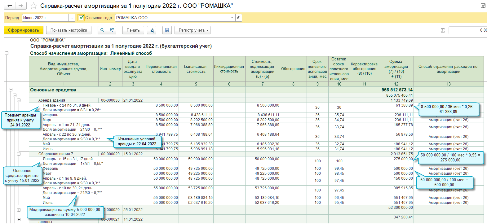 По групповым объектам расчет амортизации выполняется исходя из принципа рациональности: учитывается изменение балансовой стоимости не по дням, а в среднем за месяц. В расчете амортизации используется средняя балансовая стоимость группового объекта за месяц.