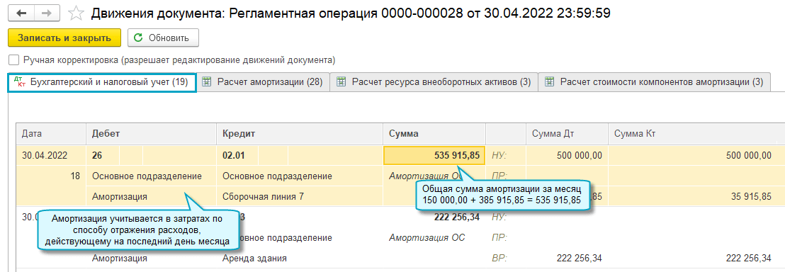 Аналогично выполняется расчет суммы амортизации предмета аренды (права пользования активом).