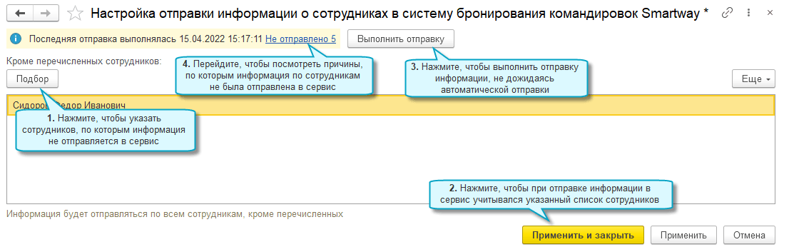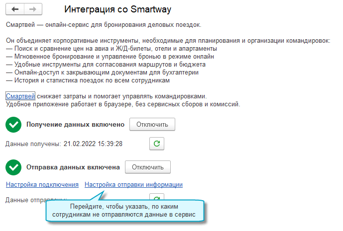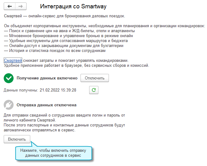 Добавлена возможность автоматической отправки информации о сотрудниках в онлайн-сервис для бронирования деловых поездок Smartway. Информация отправляется в сервис при наличии изменений.