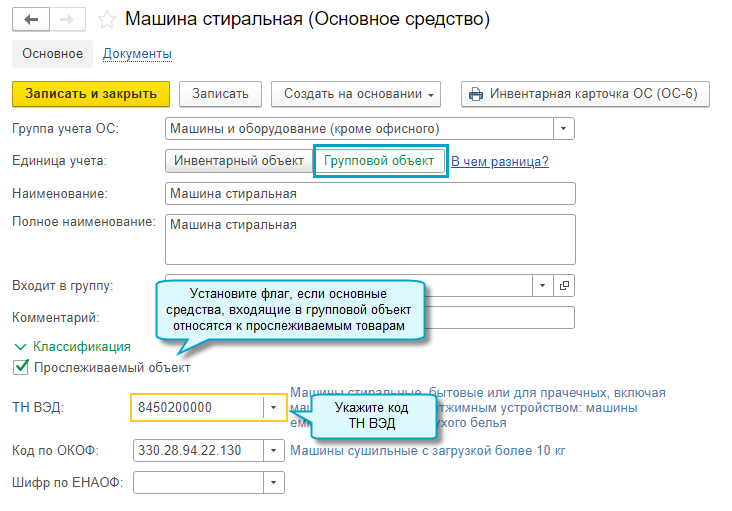 Добавлена возможность учитывать по регистрационным номерам партий товаров (РНПТ) групповые объекты основных средств.