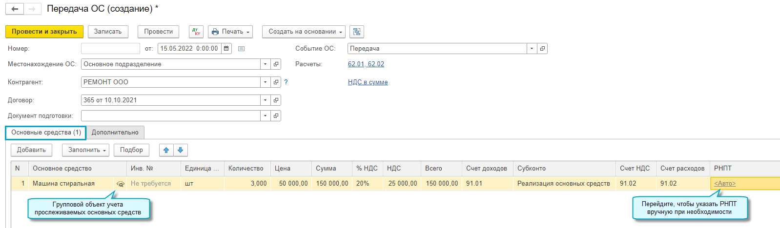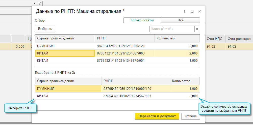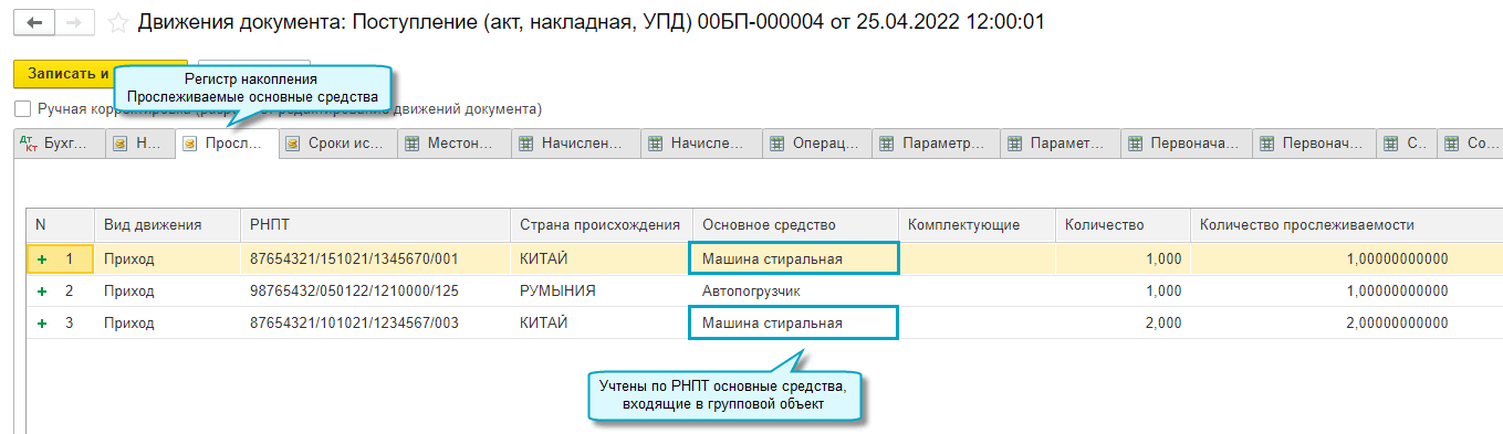 Добавлена возможность автоматического подбора РНПТ при списании и передаче прослеживаемых групповых объектов основных средств. Подбор РНПТ производится при проведении документа по методу ФИФО: первыми списываются РНПТ по основным средствам, учтенным первыми в групповом объекте. Если требуется списать конкретный РНПТ, то достаточно указать его вручную в документе.