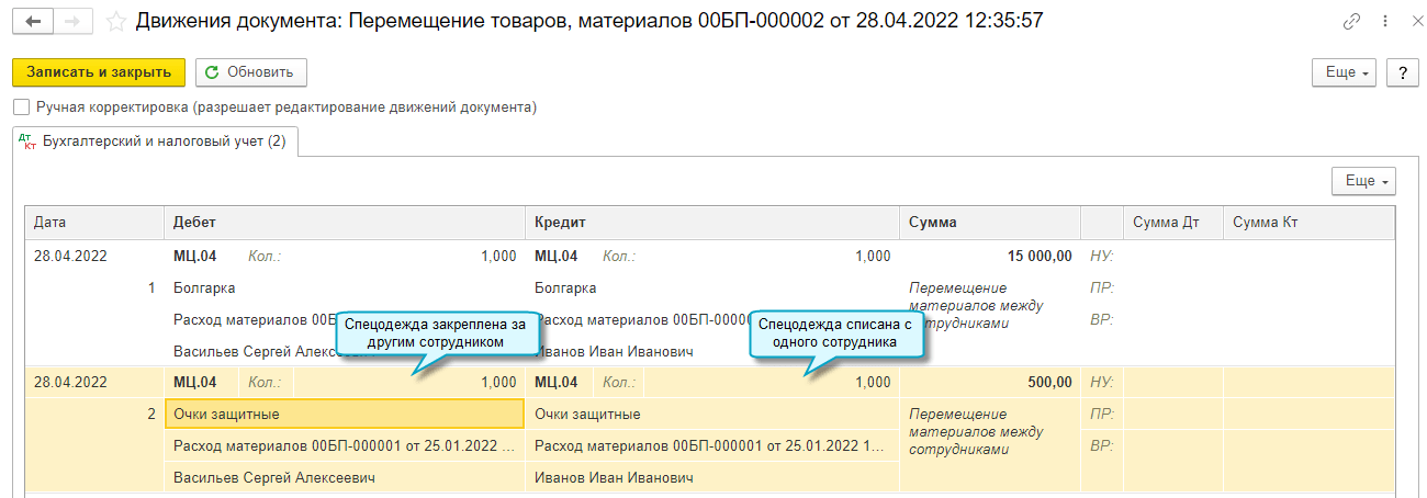 Добавлена возможность учитывать передачу между сотрудниками спецодежды и инвентаря. Перемещать можно имущество, учитываемое по сотрудникам на субсчетах счета МЦ "Материальные ценности в эксплуатации".