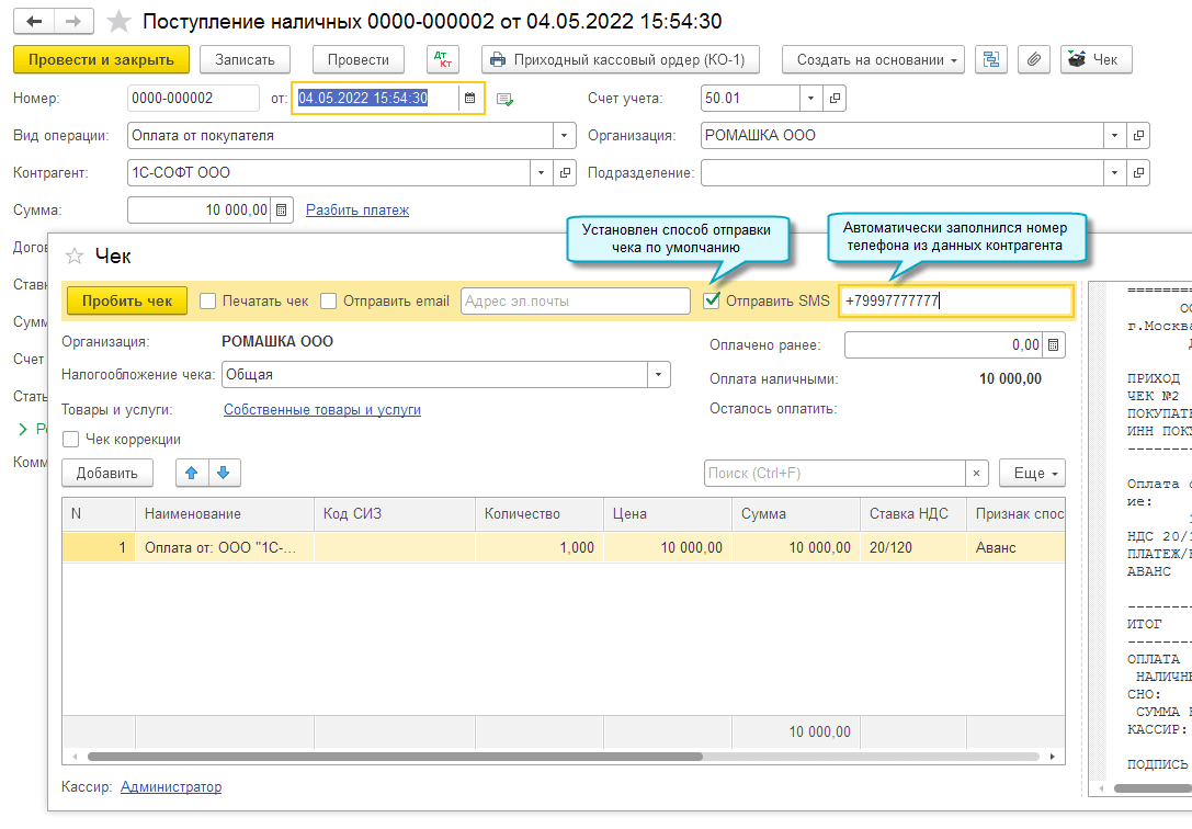 Добавлена возможность при розничной продаже отказаться от печати бумажного чека и отправить покупателю электронный чек по SMS или по электронной почте.