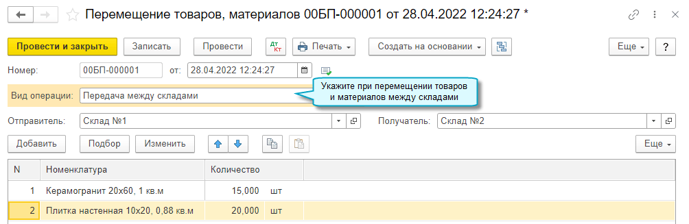 Операции перемещения товаров и материалов между складами отражаются документом Перемещение товаров, материалов с видом операции Передача между складами (в ранее выпущенных версиях документ назывался Перемещение товаров).