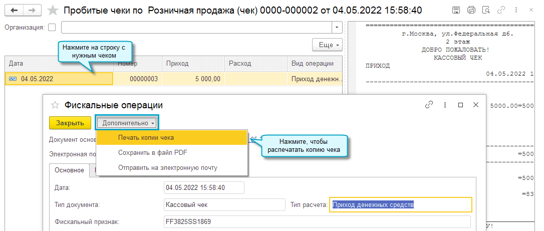 Добавлена возможность распечатать копию чека по запросу покупателя, если, например, первоначально чек был отправлен ему по SMS. Также чек можно сохранить в файл PDF, отправить на электронную почту.