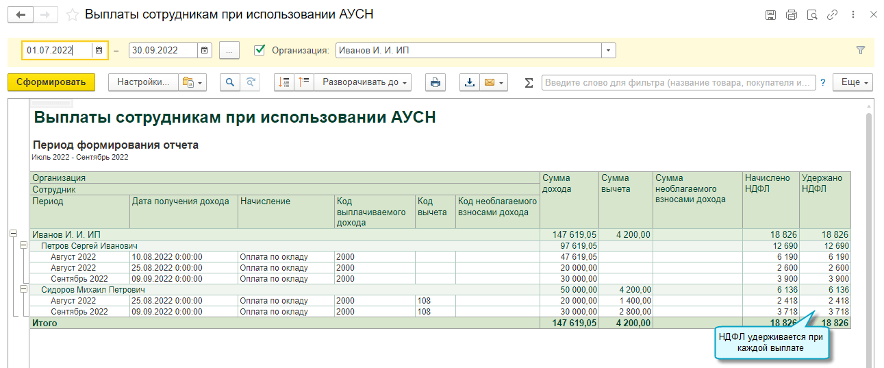 Добавлен отчет Выплаты сотрудникам при использовании АУСН с расшифровкой необлагаемых доходов, вычетов и НДФЛ.