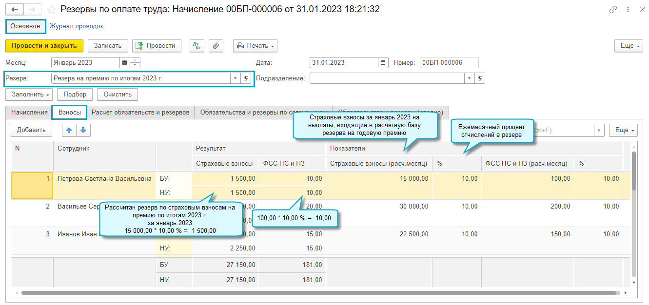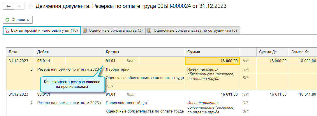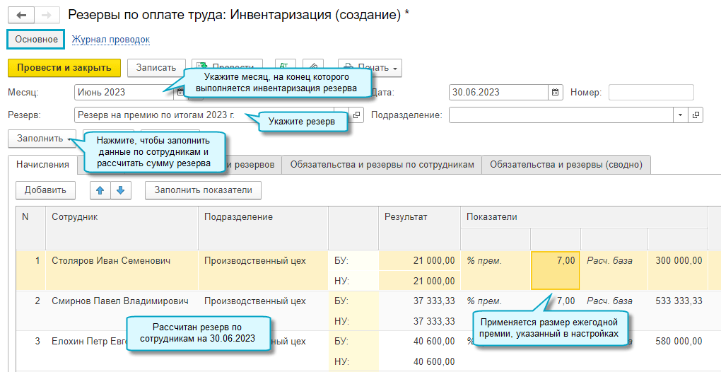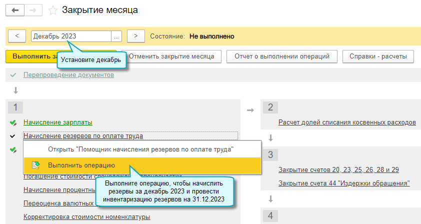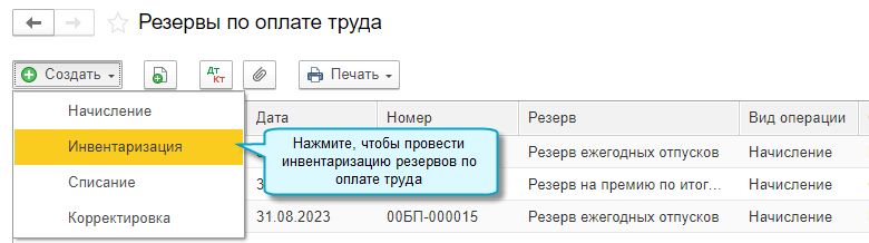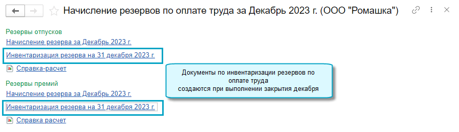 Инвентаризация резервов по оплате труда на 31 декабря выполняется автоматически при выполнении закрытия декабря.
