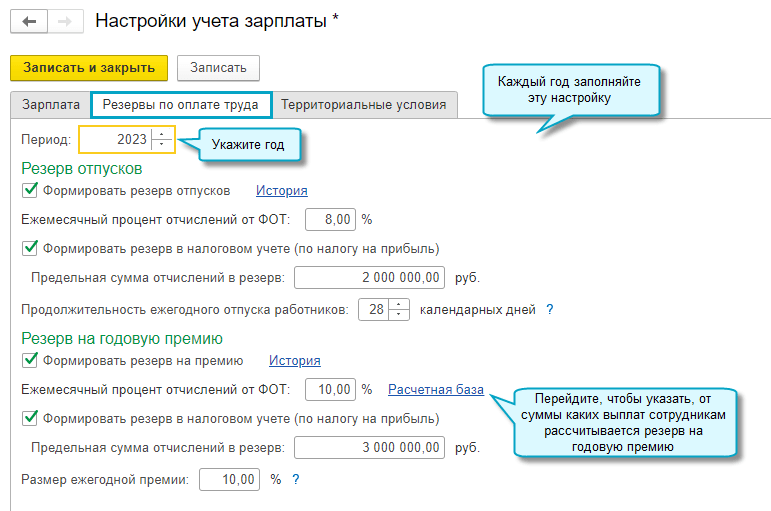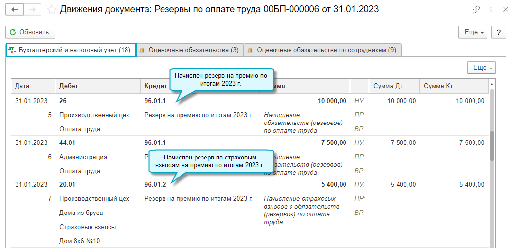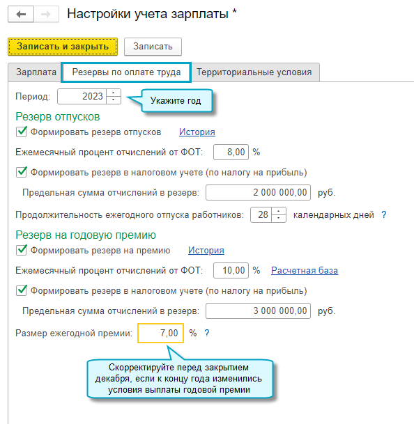 Добавлена возможность начислять оценочные обязательства (резервы) по оплате годовой премии, отражать их инвентаризацию.