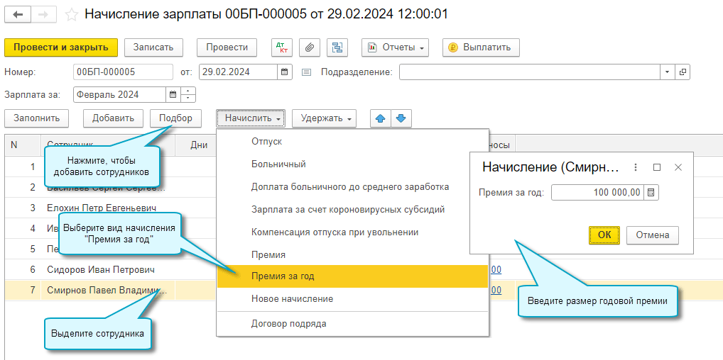 Простой интерфейс: меню "Сотрудники - Начисления".