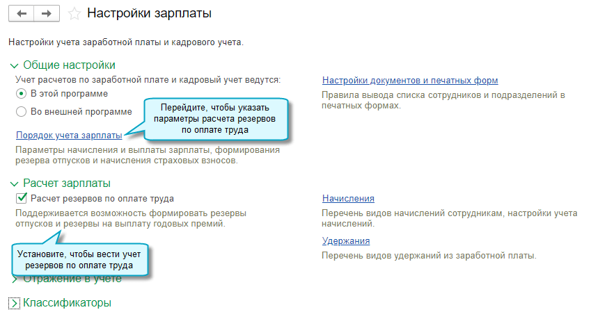 Простой интерфейс: меню "Сотрудники - Еще - Резервы по оплате труда".