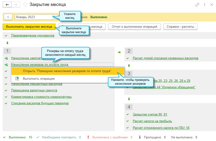 Полный интерфейс: меню "Операции - Закрытие периода - Закрытие месяца - Начисление резервов по оплате труда".