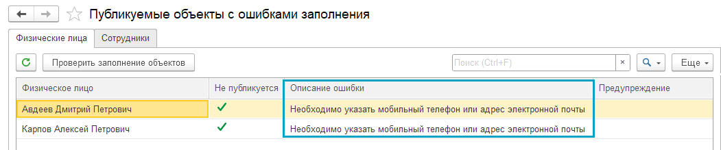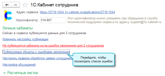 Добавлен показ списка объектов, не опубликованных в сервисе 1С:Кабинет сотрудника из-за ошибок заполнения.