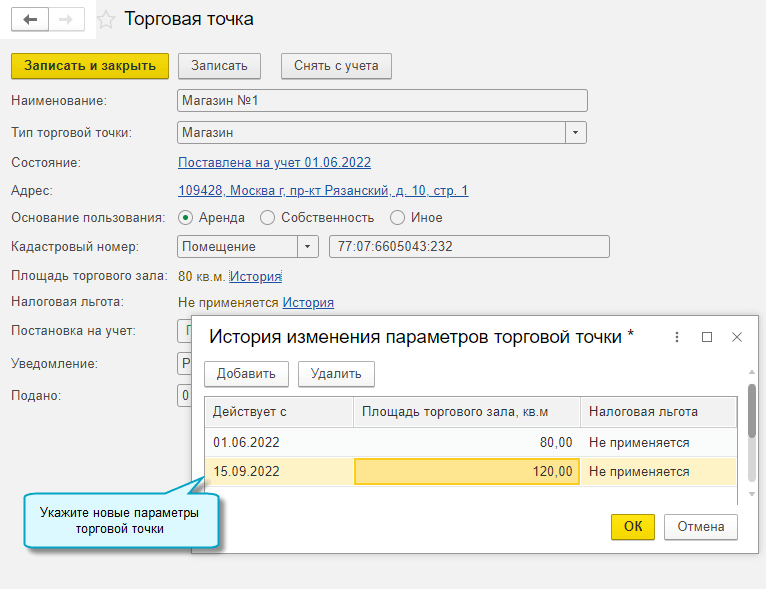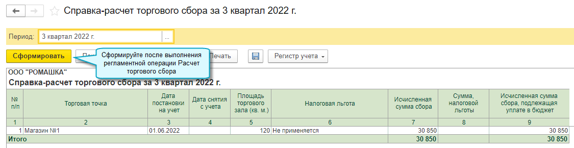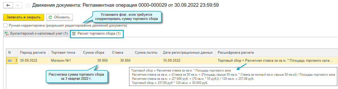 Суммы торгового сбора ежеквартально рассчитываются теперь регламентной операцией Расчет торгового сбора исходя из параметров торговой точки и текущих ставок. В прошлых версиях регламентной операцией торговый сбор только начислялся, а его сумма рассчитывалась в момент ввода торговой точки или изменения ее параметров и записывалась в карточке торговой точки.