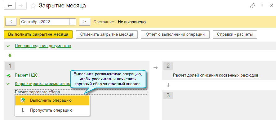 Полный интерфейс: меню "Операции - Закрытие периода - Закрытие месяца - Расчет торгового сбора".