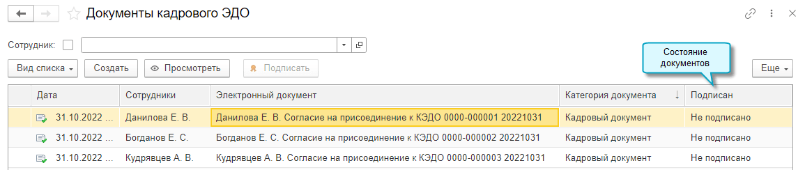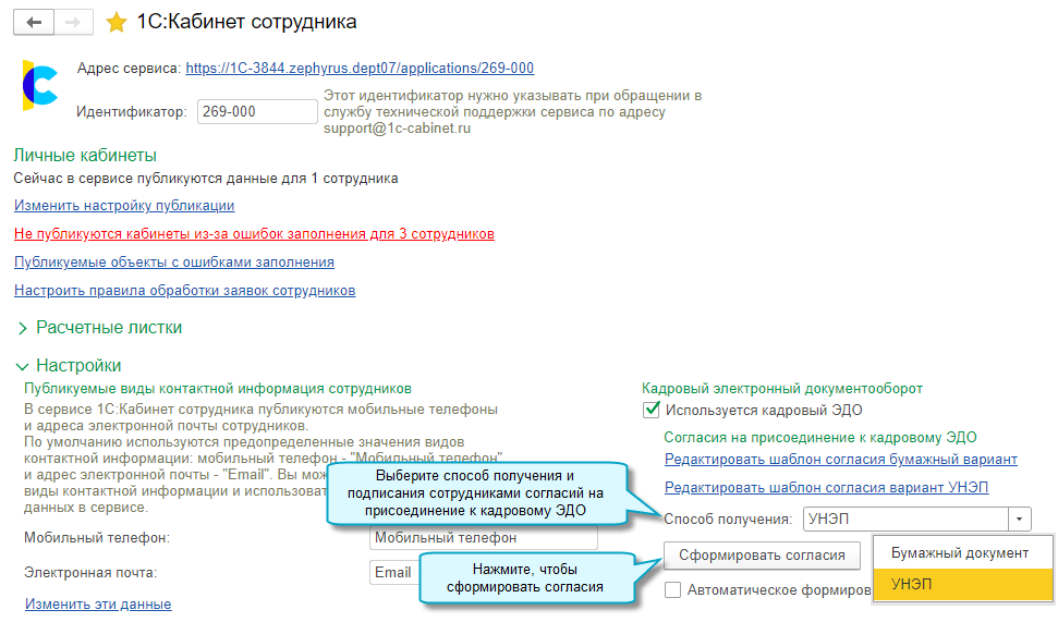 Добавлена возможность хранения и учета согласий сотрудников на присоединение к кадровому ЭДО. Функциональность доступна начиная с версии 5.0.3.66 сервиса 1С:Кабинет сотрудника.