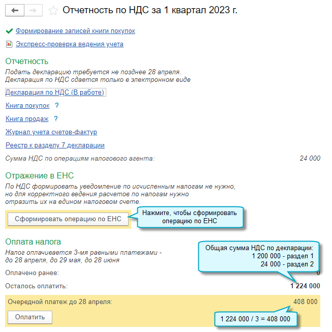Добавлена возможность корректировать автоматический зачет ЕНП на уплату налогов и взносов, отражать в учете другие операции на едином налоговом счете без подачи уведомлений по исчисленным суммам налогов.