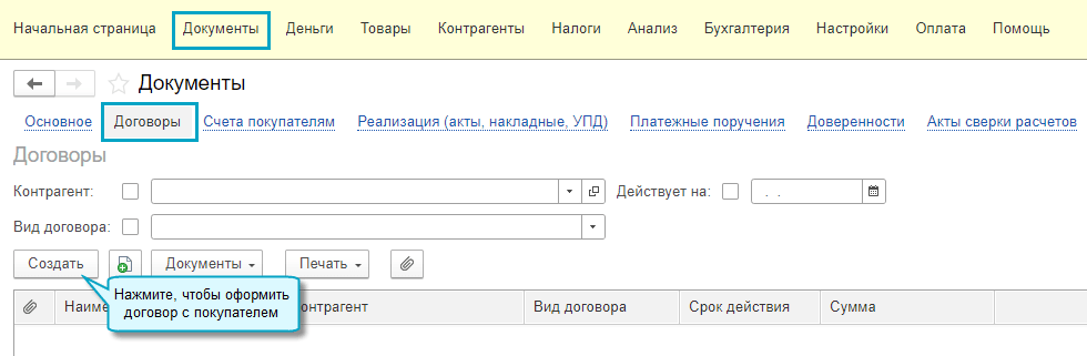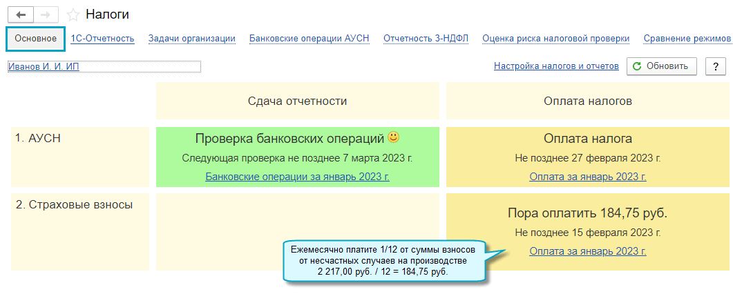 Простой интерфейс: меню "Налоги - Основное".