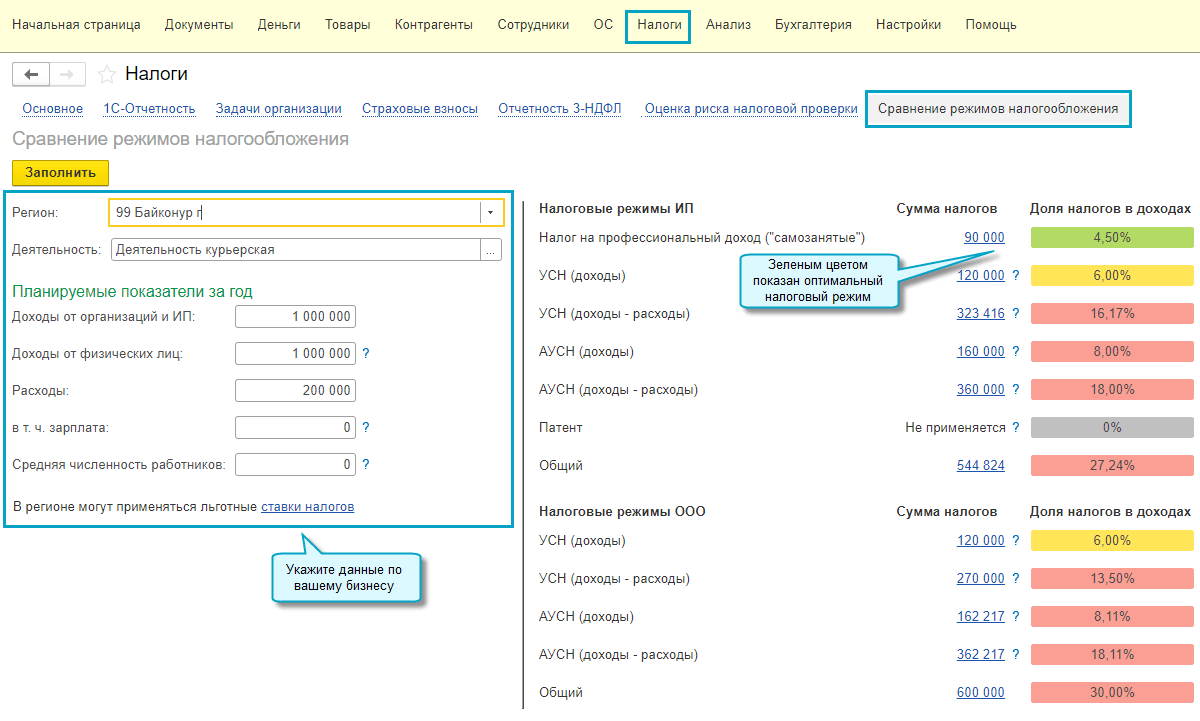 Простой интерфейс: меню "Налоги - Сравнение режимов налогообложения".