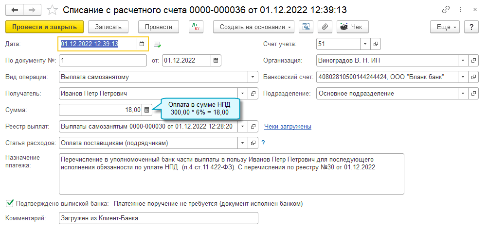 По каждому самозанятому загружается два документа Списание с расчетного счета, если самозанятый уполномочил банк уплачивать налог на профессиональный доход (НПД) со своих доходов.
