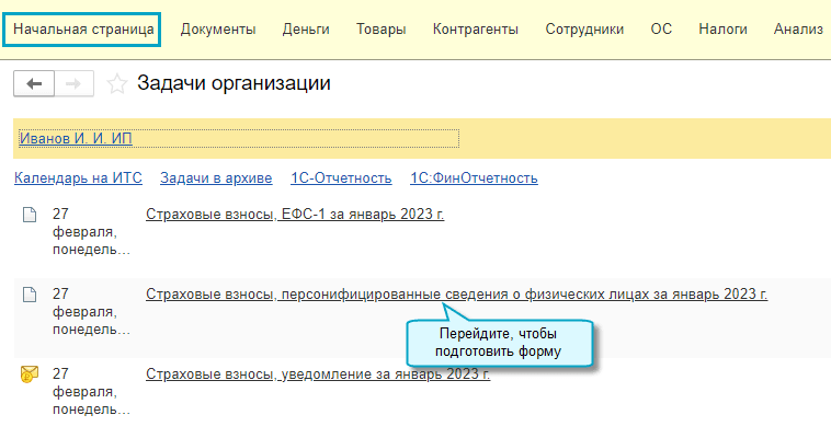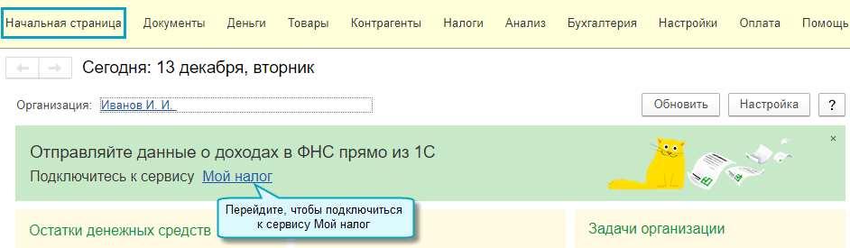 Простой интерфейс: меню "Начальная страница - Задачи организации".
