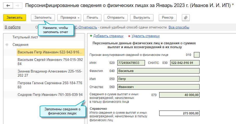Добавлено автозаполнение новой формы Персонифицированные сведения о физических лицах. Заполняется она на сотрудников и других физических лиц, с выплат которым начисляются страховые взносы. Отправлять форму требуется в ФНС ежемесячно, начиная с января 2023 года, не позднее 25-го числа месяца, следующего за отчетным (Приказ ФНС России от 29.09.2022 № ЕД-7-11/878@).