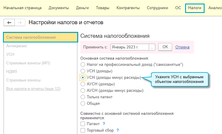 Полный интерфейс: меню "Главное - Настройки - Налоги и отчеты - Система налогообложения".