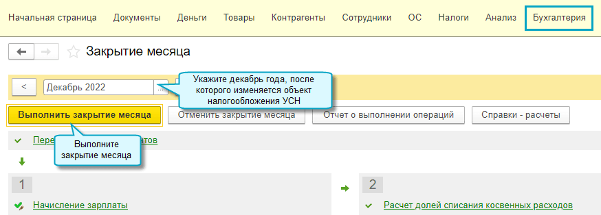 Полный интерфейс: меню "Операции - Закрытие периода - Закрытие месяца".