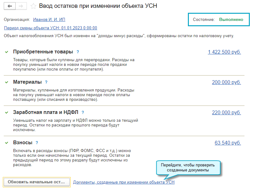 Добавлена возможность автоматического ввода остатков налогового учета по УСН при смене объекта налогообложения.