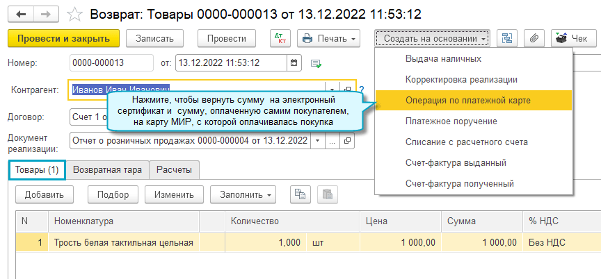 Возврат на основании чека используется, когда чек при продаже товара был пробит в том же приложении, где оформляется возврат.