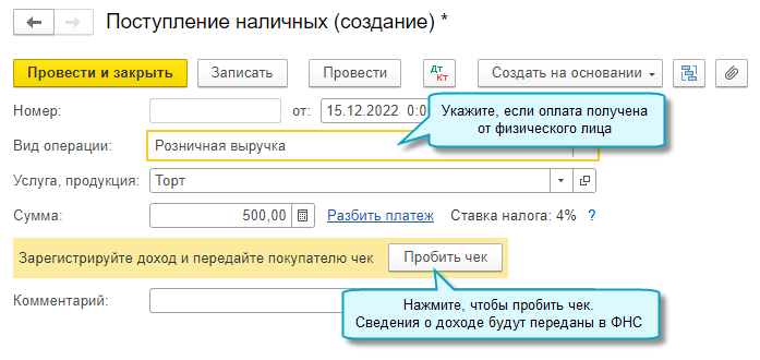 Чеки на доходы по НПД формируются в приложении. Данные об этих доходах передаются в сервис ФНС "Мой налог" автоматически. Функционал доступен для облачных версий.