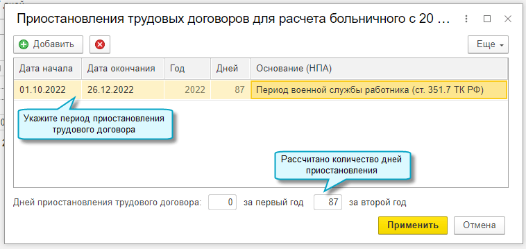 Добавлена возможность в расчете больничных с 01.01.2023 учитывать приостановление трудового договора на период мобилизации сотрудника (Федеральный закон от 07.10.2022 № 379-ФЗ).