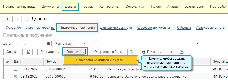Отдельные платежные поручения формируются в задачах по расчету или уплате конкретных налогов.