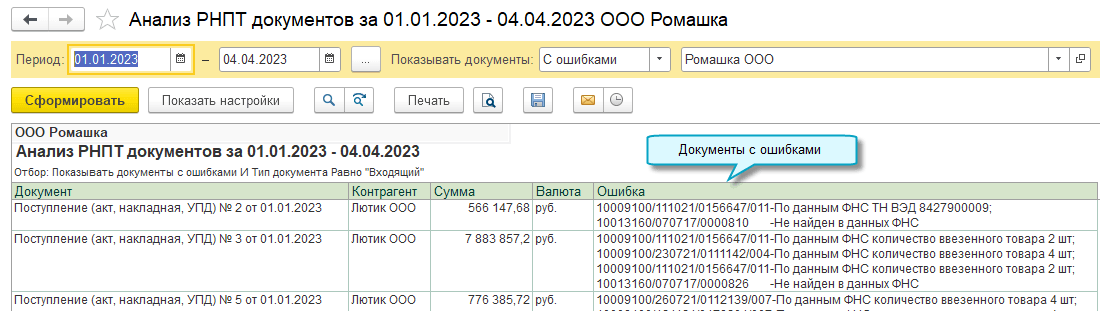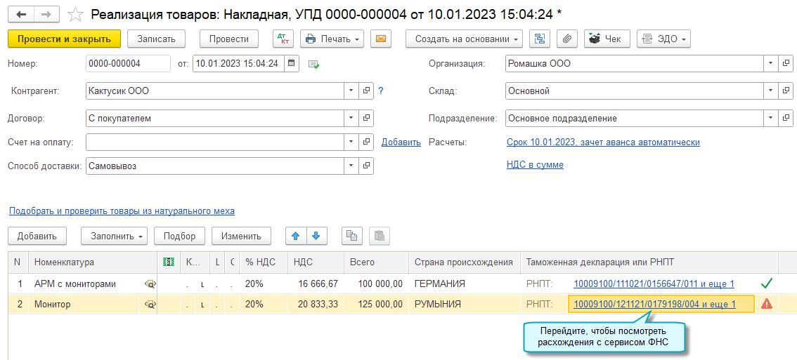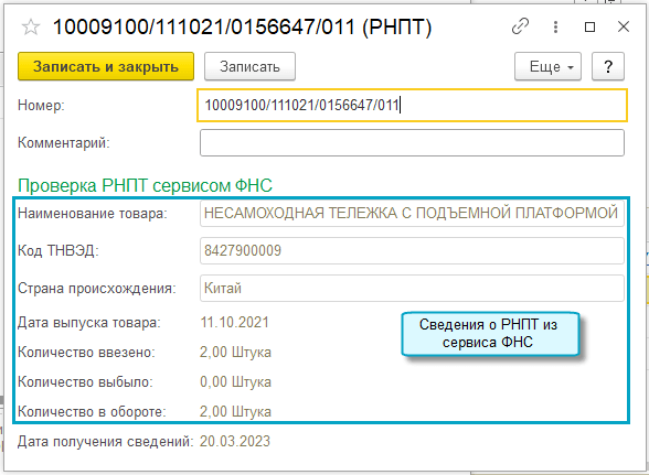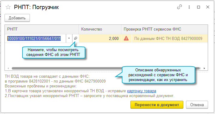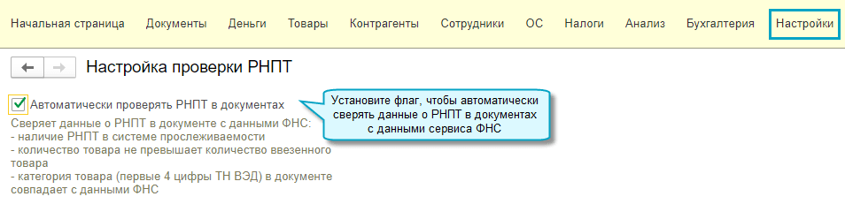 Добавлена возможность автоматически проверять РНПТ в документах. Сравниваются данные о РНПТ в документе и в сервисе ФНС "Проверка регистрационного номера партии товара (РНПТ)".