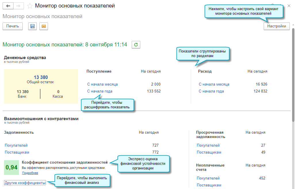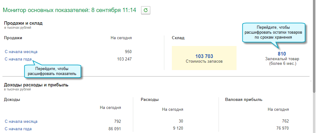 Обновлен Монитор основных показателей для руководителя. Теперь с его помощью можно анализировать не только движение денежных средств и задолженность, но и доходы, расходы и товарные остатки на складе.