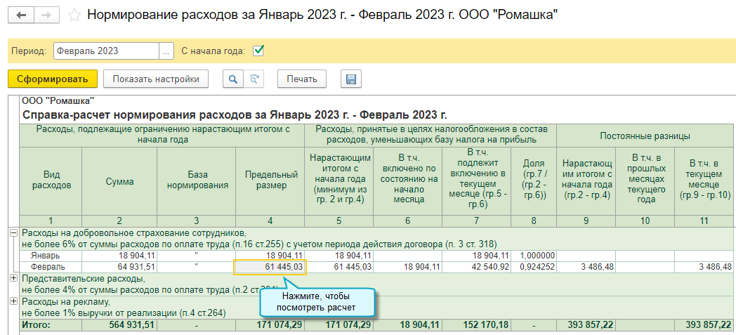 Простой интерфейс: меню "Бухгалтерия - Закрытие периода - Справки-расчеты - Налоговый учет по налогу на прибыль - Нормирование расходов".