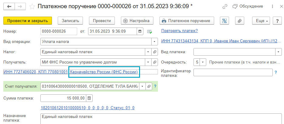 Изменено наименование получателя единого налогового платежа и других платежей, администрируемых налоговыми органами, в платежных поручениях. Теперь заполняется "Казначейство России (ФНС России)" вместо "Управление Федерального казначейства по Тульской области (Межрегиональная инспекция Федеральной налоговой службы по управлению долгом)". Остальные реквизиты - прежние (Письмо ФНС России № ЕД-26-8/8@, Казначейства России № 07-04-05/05-12658 от 15.05.2023).