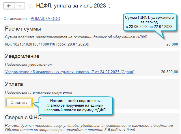 Подготовка платежного поручения на единый налоговый платеж на сумму НДФЛ перенесена в отдельную задачу организации по уплате НДФЛ. Поскольку НДФЛ уплачивается не за месяц начисления заработной платы, а по периодам его удержания - в большинстве случаев, это периоды с 23-го числа предыдущего месяца по 22-е число текущего месяца.