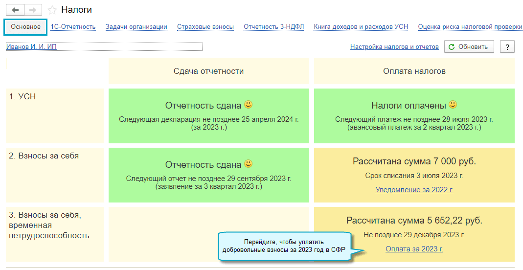 Добавлена задача по уплате индивидуальным предпринимателем добровольных взносов на социальное страхование в Социальный фонд России (СФР) со сроком выполнения не позднее последнего рабочего дня в календарном году.