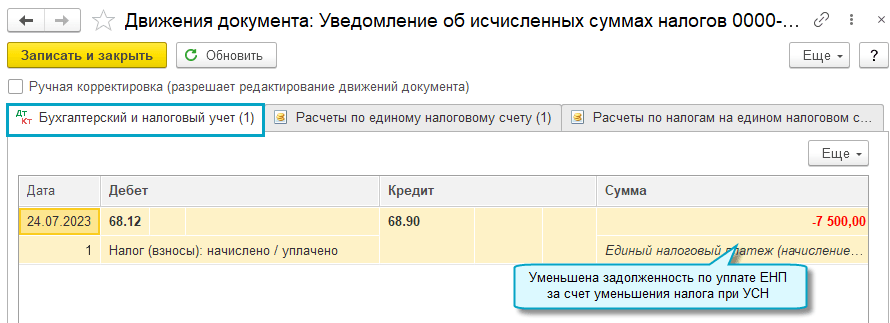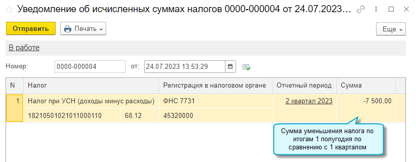 Добавлена возможность сформировать и отправить в ФНС уведомление на уменьшение налога с отрицательной суммой. Например, когда при УСН "доходы минус расходы" за 2 квартал получен убыток, в результате чего налог за 1 полугодие меньше, чем налог за 1 квартал (Письмо ФНС России от 10.07.2023 № СД-4-3/8716@).
