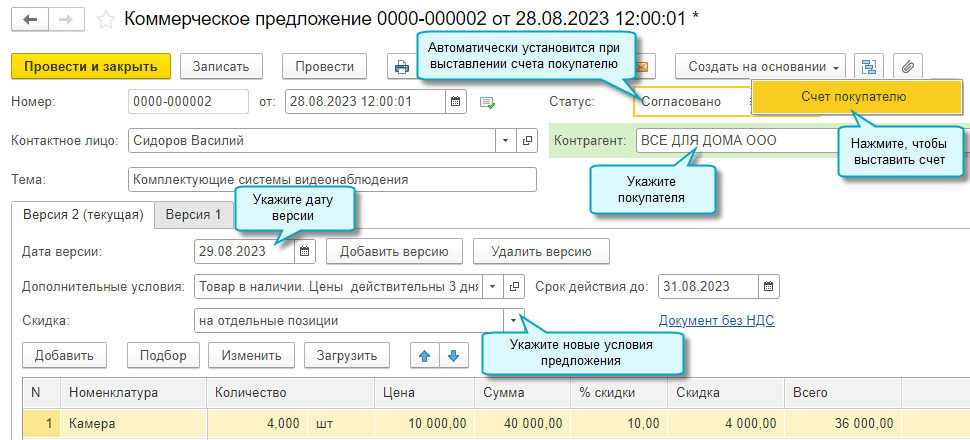 Добавлена возможность оформить коммерческое предложение для покупателя. В процессе согласования условий можно добавлять и сохранять его разные версии.