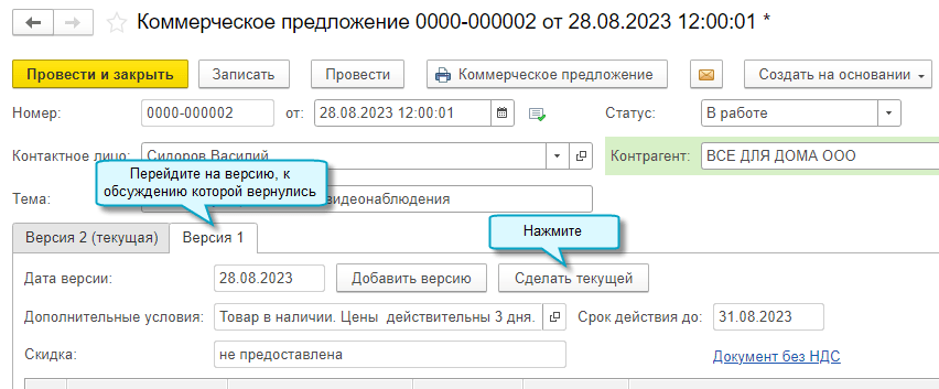 Когда создано несколько версий предложения, рабочей считается текущая версия. Любую версию можно сделать текущей.