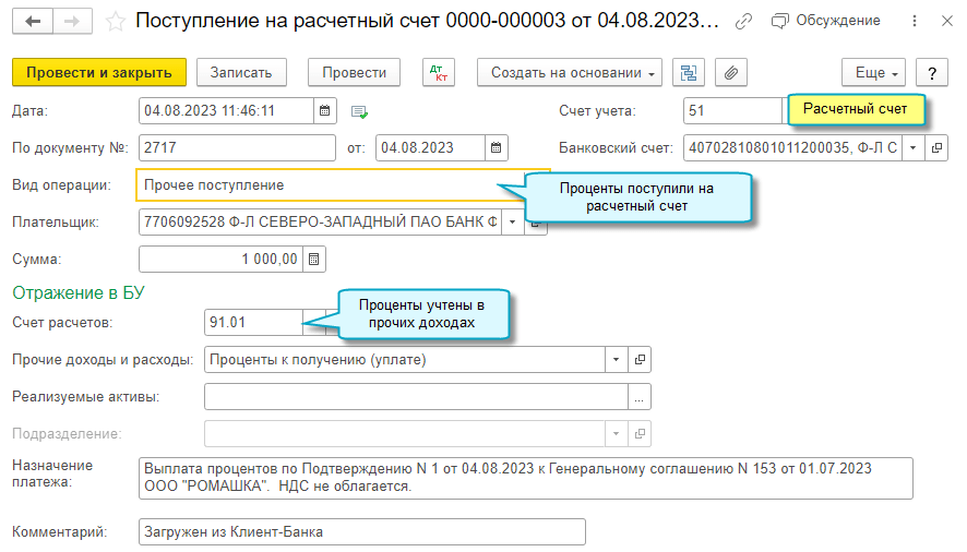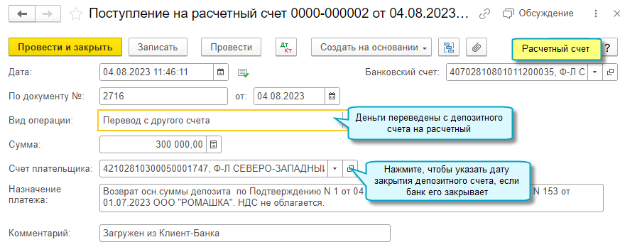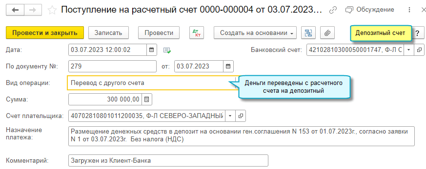 Также автоматически в список банковских счетов организации добавляется депозитный счет, если для каждого депозита банком открывается счет.