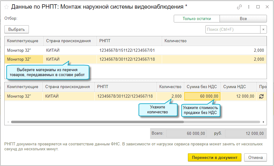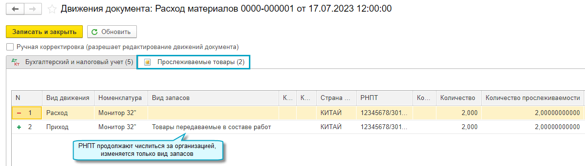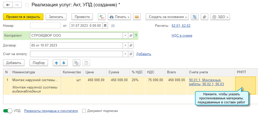 Добавлена возможность передавать от подрядчика заказчику РНПТ по прослеживаемым материалам, использованным при выполнении работ. Это относится к материалам, которые не теряют своих первоначальных характеристик в результате выполнения работ. РНПТ заполняются в счет-фактуре и УПД согласно рекомендациям ФНС (Письмо ФНС России от 22.12.2021 N СД-4-15/17982@, Письмо ФНС России от 21.02.2023 № ЗГ-3-15/2580@). Подробнее...