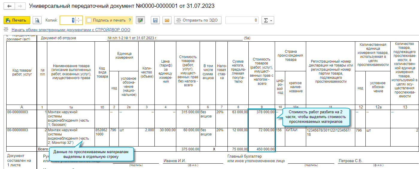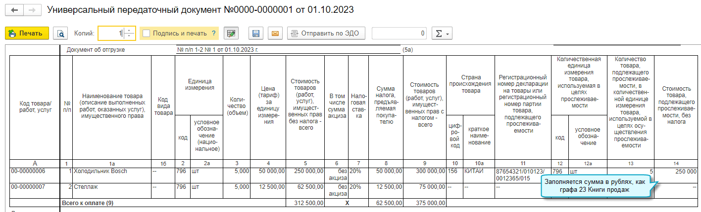 С 01.10.2023 для реализации прослеживаемых товаров в УПД и счет-фактуру добавлена графа с их стоимостью. Если нет прослеживаемых товаров, применяются формы без изменений (Федеральный закон от 31.07.2023 № 389-ФЗ). Подробнее...