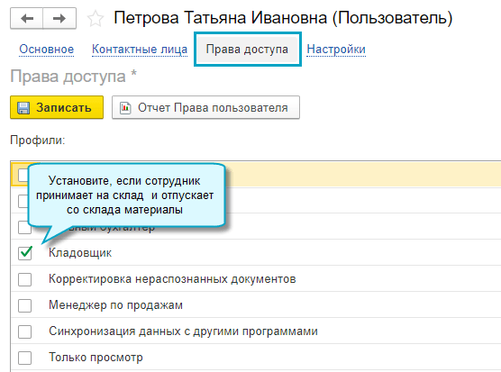 Добавлена возможность ограничить права на работу с документами для сотрудников, принимающих материалы на склад от поставщиков и отпускающих их со склада в производство. Для этого добавлен профиль доступа Кладовщик.